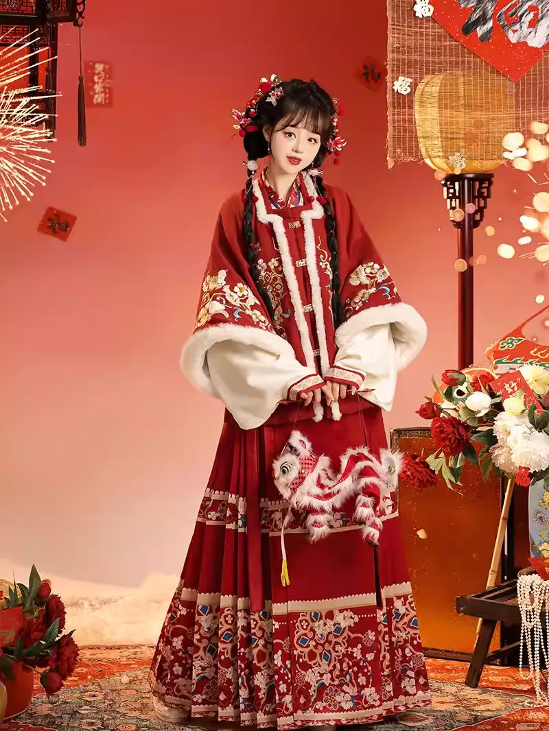 This is a Ming Dynasty New Year Style Aoqun Hanfu, consisting of three pieces: a jacket, a blouse and a skirt. The vibrant red primary color is perfect for festive occasions. The jacket is embroidered with interwoven floral and auspicious patterns. Cuffs and plackets feature fluffy faux rabbit fur trim. Paired with a tiger head hat, it’s both warm and adorable.