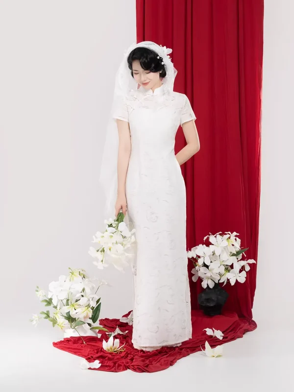 - Romantic white Qipao that fully showcases elegance and a sweet atmosphere.