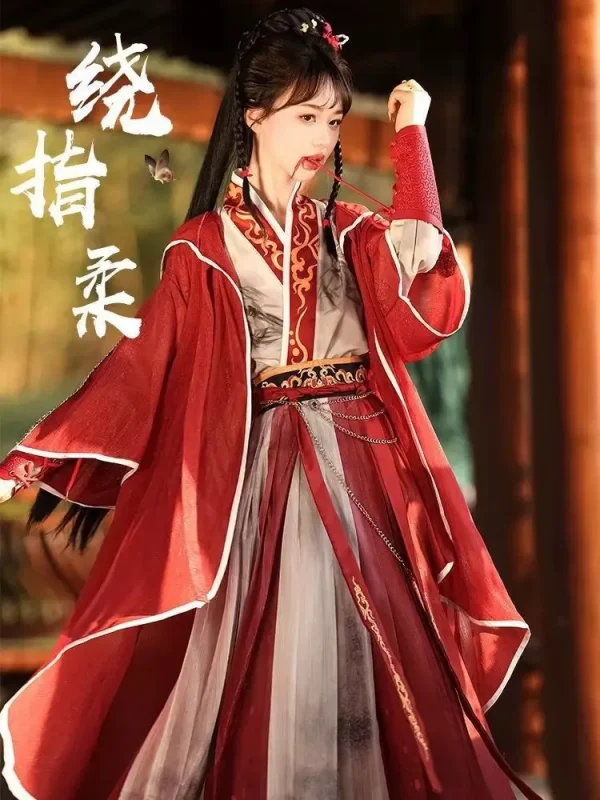 This red Qiyao Ruqun Hanfu with Song-style wuxia aesthetics blends classic martial arts charm with the elegance of traditional Qiyao Ruqun.It’s soft and comfortable, making it perfectly suited for daily wear, cultural events, and photography sessions.