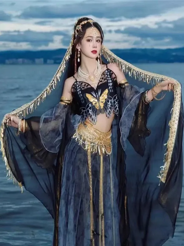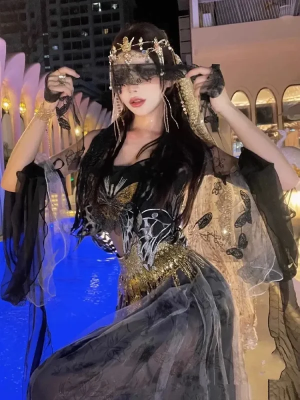 This Hanfu blends Dunhuang Feitian aesthetics with exotic style, crafted from black tulle fabric. The cropped top is form-fitting with a waist-baring design, and the black tulle is accented with gold patterns. Picture yourself photographing by the beach or pool at night—you’ll look just like a Feitian fairy stepping right out of a Dunhuang mural.