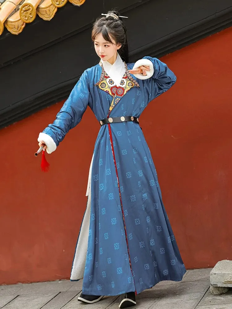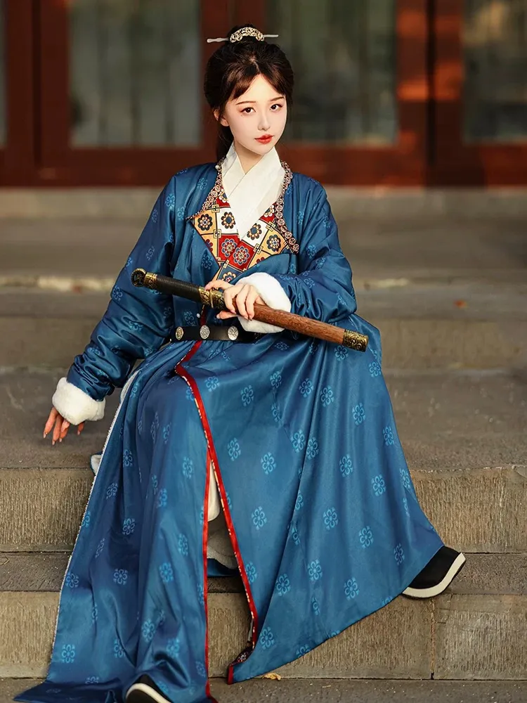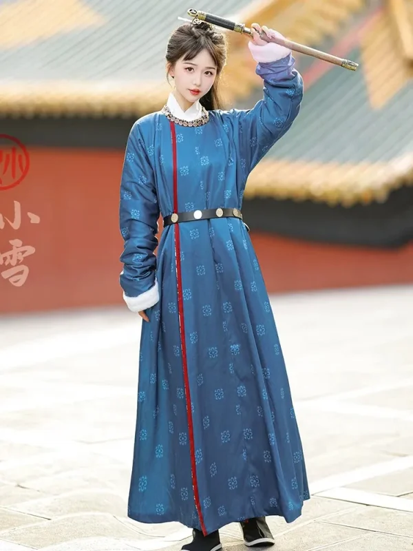 This is a thickened Hanfu pao featuring a fleece-lined interior and fuzzy cuffs. The garment is adorned with exquisite printed patterns that fully embody traditional Chinese style and elegance. Cinching it with the wide waist belt creates a neat, sharp silhouette, exuding a chivalrous aura.