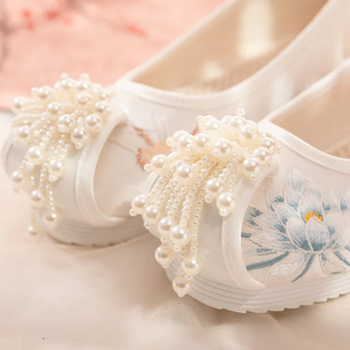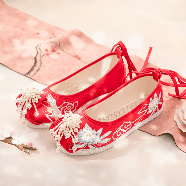 These shoes are meticulously crafted by artisans with over 12 years of embroidery experience, utilizing the intangible cultural heritage technique of Suzhou embroidery. The shoe upper features delicate needlework depicting a dynamic bead curtain pattern, accented with cloud motifs. The bead curtain symbolizes warding off misfortune and bringing good luck, while the cloud patterns represent auspiciousness and prosperity. Every stitch embodies the inheritance of traditional culture and perfectly showcases Chinese aesthetic artistry.