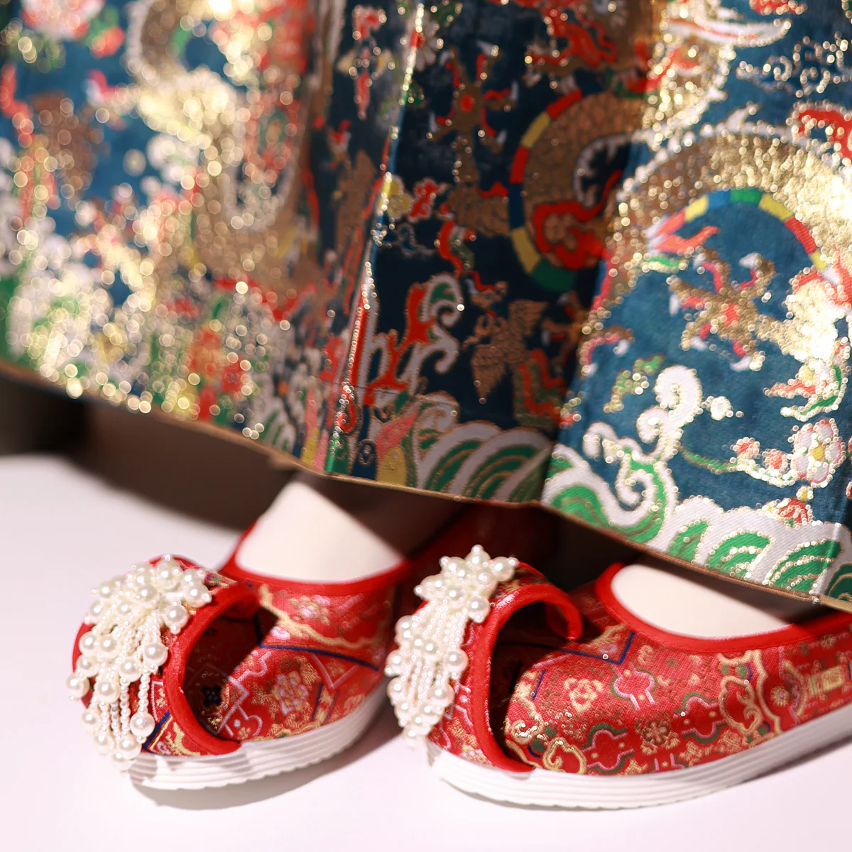Hand wash gently in cold water with mild detergent. Use a soft-bristled brush to clean embroidery and pearls. Do not bleach. After washing, blot dry and stuff with tissue paper to maintain shape (pay special attention to preserving the toe curve on the upturned toe style). Lay flat to air-dry away from direct sunlight. Avoid vigorous rubbing of pearl areas to prevent detachment.