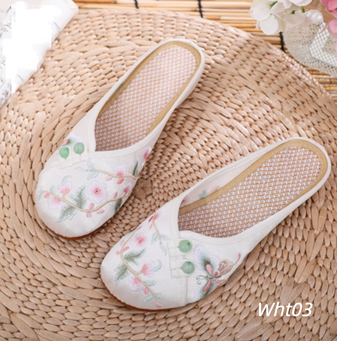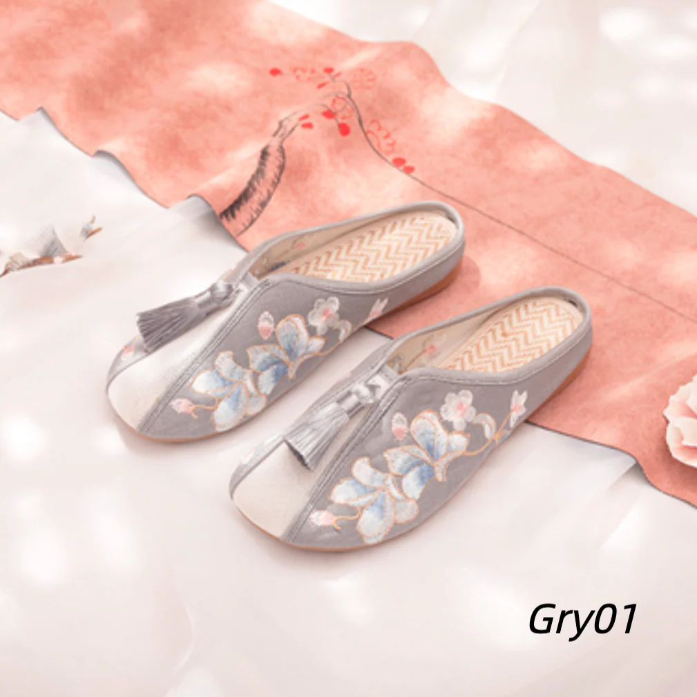 Handcrafted by artisans with over a decade of embroidery experience using China’s intangible cultural heritage Suzhou embroidery technique: The hibiscus pattern is rendered with dense satin stitching, featuring uniformly smooth stitches at 15 stitches per square centimeter, with colors naturally complementing the shoe upper. In Chinese culture, the hibiscus flower symbolizes “resilience, beauty, and perpetual vitality.” The open-back design integrates modern minimalist aesthetics, making these shoes a wearable embodiment of intangible cultural heritage that bridges traditional craftsmanship with everyday functionality.