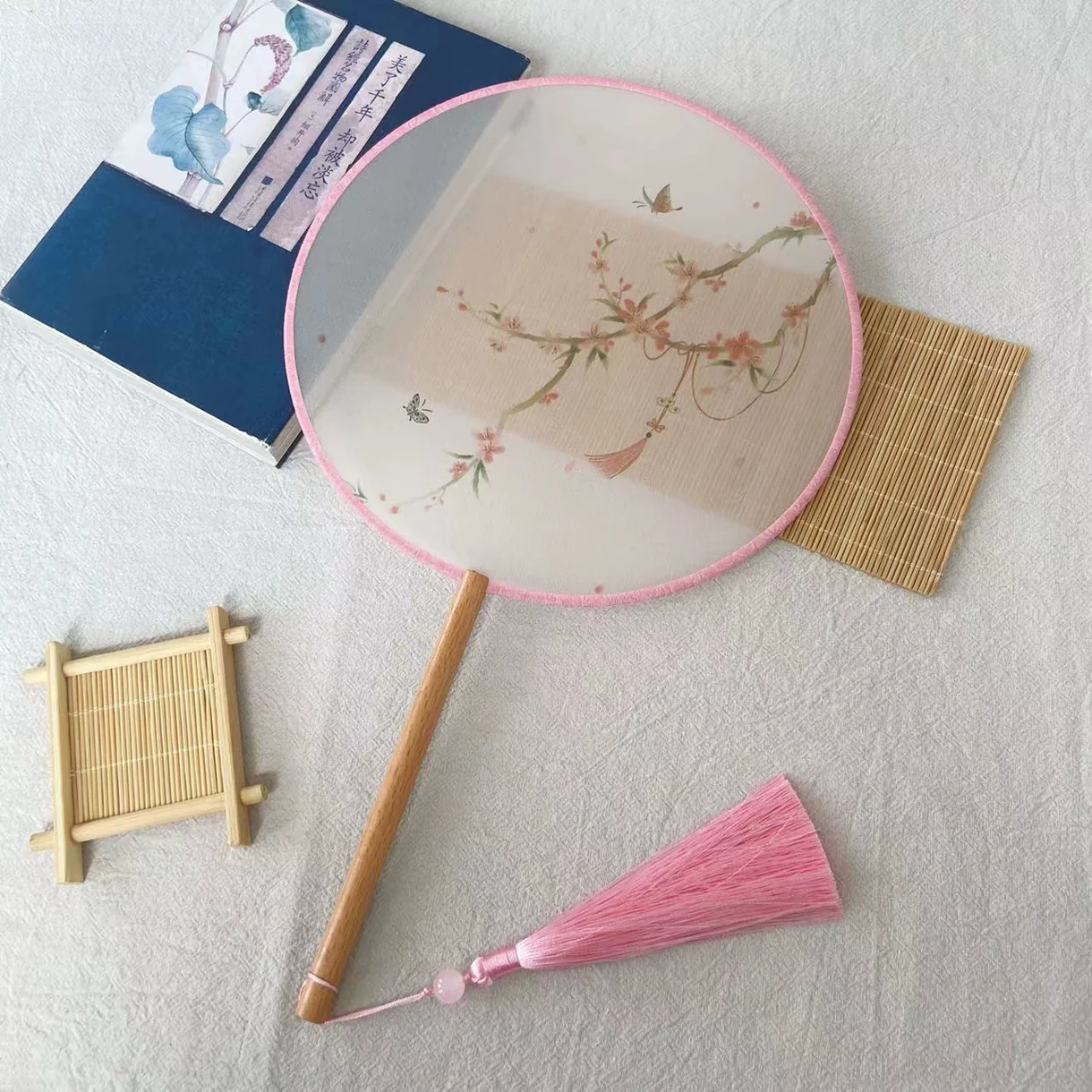 Translucent Silk Floral Print Tuanshan Round Fan, inspired by Han Dynasty round fan designs, features a delicate sheer silk fabric adorned with vibrant peach blossom patterns. The soft pink and white hues exude Eastern elegance.