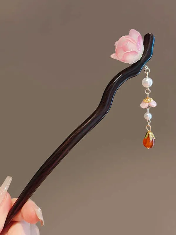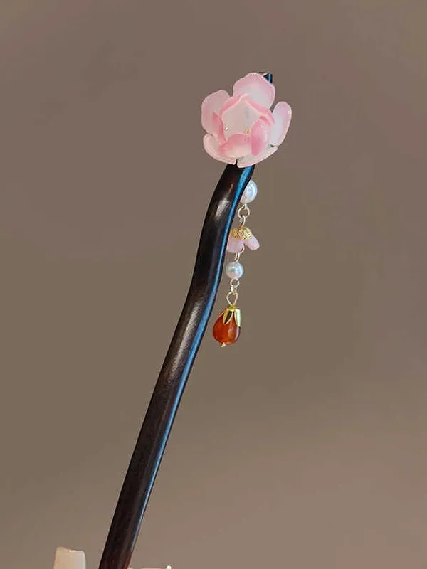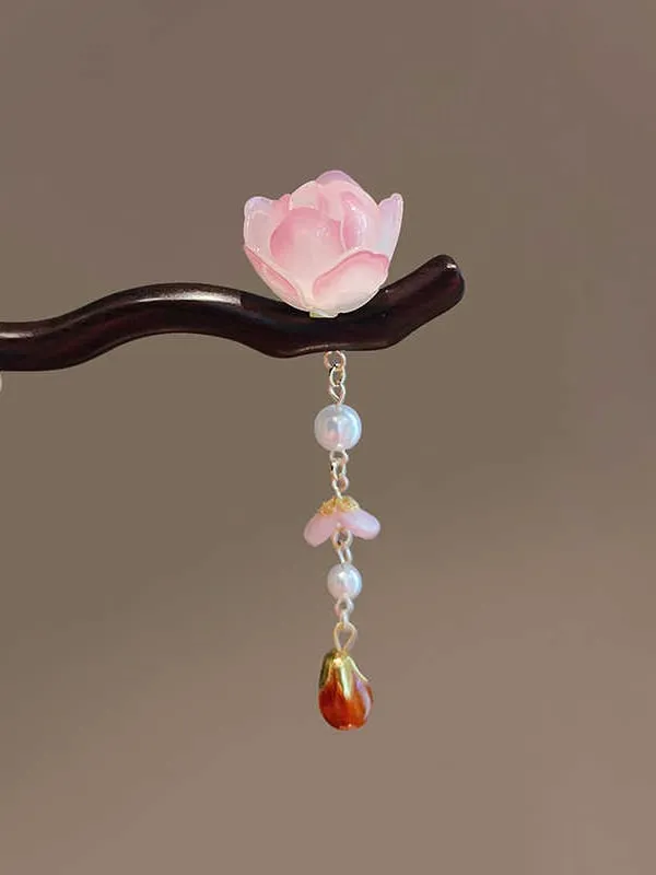 This pink-petaled tassel Chinese floral hairpin is a classic choice for traditional Chinese accessories. Featuring a blooming pink flower as the pin head, it is paired with flowing cotton-linen tassels for a graceful and elegant look.
