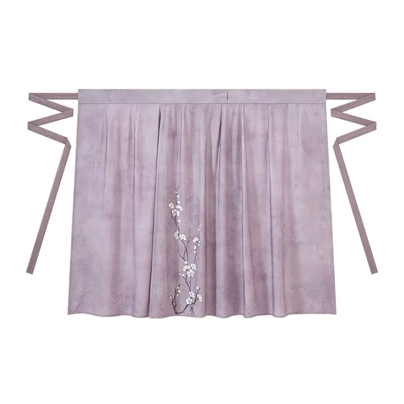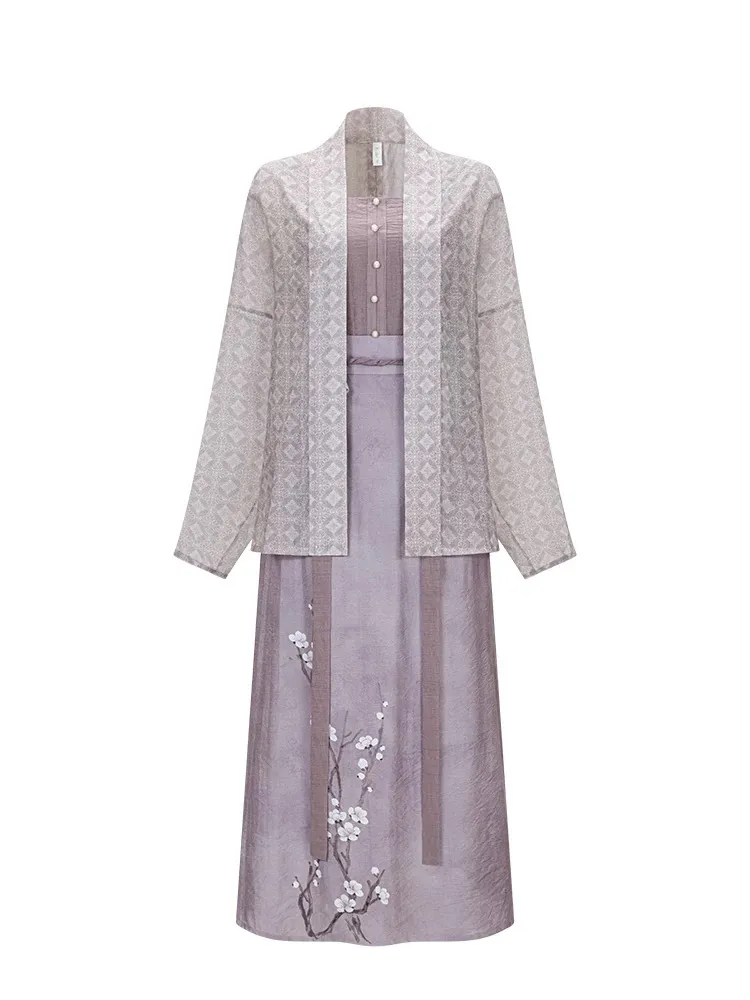 This hanfu blends Song and Ming Dynasty styles, features a cool lavender-gray as its primary hue, creates an ethereal ambiance of purple mist through the contrast of light and dark shades within the same color family, adorns ink-wash style plum blossom embroidery to avoid monotony, and selects different fabric pairings for the outer coat, camisole, and skirt after our designers tested 10 fabric types to ensure comfort and a flattering fit.