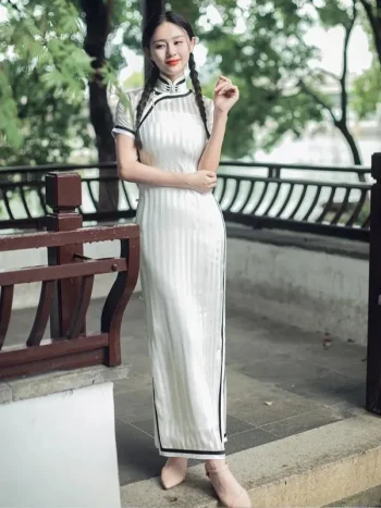Old Shanghai Style White Striped Cheongsam (Qipao) Dress
